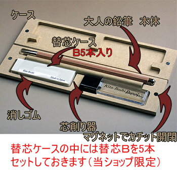 】 ◎大人の鉛筆に専用のペンケース、消しゴム、替芯ケース(替芯B5本付き)、芯削り器が付いたギフトセットです。