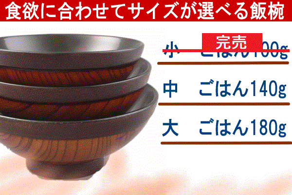 → 商品の詳細 サイズ 大 13.4×5.8cm サイズ 中 12.2×5.8cm サイズ 小 は完売しました 素 材 木製、漆塗り カラー 拭き漆内黒 名前入れ 名前入れできます ※ちなみに ごはん140g=225キロカロリー ごはん180g=290キロカロリー 盛り付け加減により入る量はかわります。