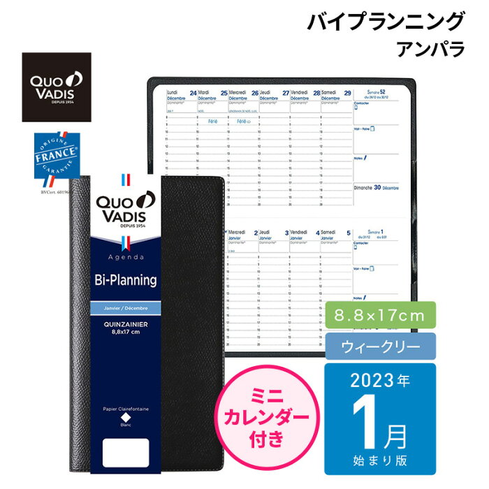 【特典付き予約販売】2023年 1月始まり 手帳 スケジュール帳 クオバディス QUOVADIS ウィークリー ダイアリー 【バイプランニング】(週間バーチカル・スリムサイズ 17×8.8cm・フランス語版・ホワイトペーパー)アンパラ