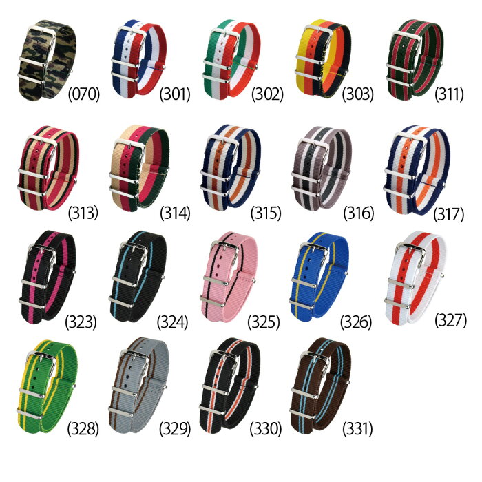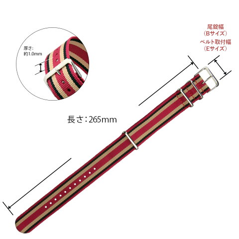 商品スペック カラー カムフラージュ Camouflage (070) フランス France (301) イタリア Italy (302) ドイツ Germany (303) グリーン&2レッド Green&2Red (311) ダークブルー&レッド DarkBlue&Red (312) レッド&2ベージュ Red&2Beige (313) ビー&アール&ジー B&R&G (314) センターブラウン CenterBrown (315) モスグリーン MossGreen (316) センターオレンジ CenterOrange (317) ブラック×ピンク Black×Pink (323) ブラック×スカイ Black×Sky (324) ピンク×ブラック Pink×Black (325) ブルー×イエロー Blue×Yellow (326) ジャパン Japan (327) グリーン×イエロー Green×Yellow (328) グレー×ブラウン Grey×Brown (329) ブラック×ホワイト×オレンジ Black×Wh×Or (330) ブラウン×スカイ Brown×Sky (331) 素材 ナイロン 長さ 【男性用サイズ】 全長:265mm 厚さ 約1.0mm サイズ展開 【男性用サイズ】 E18mm-B18mm E20mm-B20mm E22mm-B22mm E24mm-B24mm ※【E】は時計に装着する側の幅、【B】はバックルの幅です。