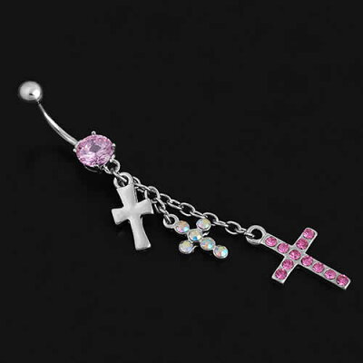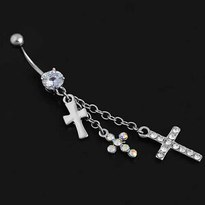 3つの異なるクロスのチャームが揺れるへそピアス。