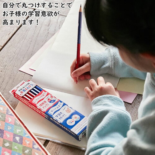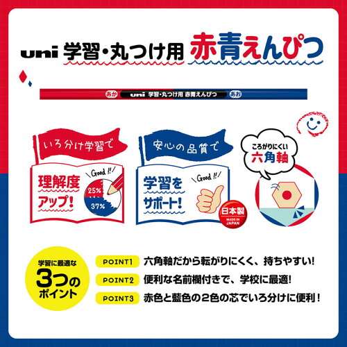 ・シンプルで飽きにくいデザインです! ・転がりにくく、正しい持ち方が学びやすい六角軸! 従来の朱藍鉛筆、朱通し、藍通しでは丸軸が主でしたが、学童向けの製品であることを意識して正しい持ち方の練習がしやすく、軸が机上で転がりにくい六角軸にしています。